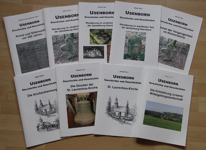 Mit dem zum Dorfjubiläum 2005 erschienenen Buch „USENBORN – Geschichte und Geschichten“ hat Alfred Franz begonnen, Aspekte der Geschichte seines Haimatdorfes den Mitbewohnern und anderen Geschichtsinteressierten nahe zu bringen. Natürlich war es nicht möglich, alle vorhandenen Erkenntnisse in dem 400-seitigen Buch festzuhalten. Während der letzten Jahre hat er weitere Aspekte der Usenborner Geschichte bearbeitet, die nun in einer Broschüren-Reihe veröffentlicht werden. Die Broschüren im DIN A4-Format und schönem Buntdruck tragen auch den Titel „USENBORN – Geschichte und Geschichten“ und als Untertitel das jeweils bearbeitete geschichtliche Thema.
