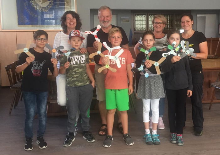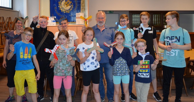 „Zimmerbumerangs im Bausatz“ war das Thema dieses Bumerang-Workshops. Leider konnten nicht alle interessierten Kinder kommen, weil sie Nachmittagsunterricht hatten und eine Verlegung der Veranstaltung war nicht mehr möglich. Basteln und Spaß standen wieder im Vordergrund. Kursleiter Alfred Franz hat die Modelle und die Bausätze so entworfen, dass ein Zimmerbumerang schnell aus drei Flügeln und zwei Klebescheiben zusammengebaut werden kann. Der Vorteil der kleinen Gruppe bestand darin, dass alle ungehindert ihre Zimmerbumerangs werfen konnten. Die Zeit verging wieder viel zu schnell. Aber der Kursleiter hat ja noch mehr Bausatz-Modelle entwickelt, sodass alle, die Spaß am Bauen und Werfen von Zimmerbumerangs haben, sich zu weiteren Terminen treffen können. Und wenn irgendwann ein Werkraum verfügbar ist, kann dem Wunsch vieler Kinder entsprochen und auch größere Holzbumerangs gebaut werden. Die Patenschaft für diese Veranstaltung hatte wieder der Männdergesangverein „Liederkranz“ übernommen.