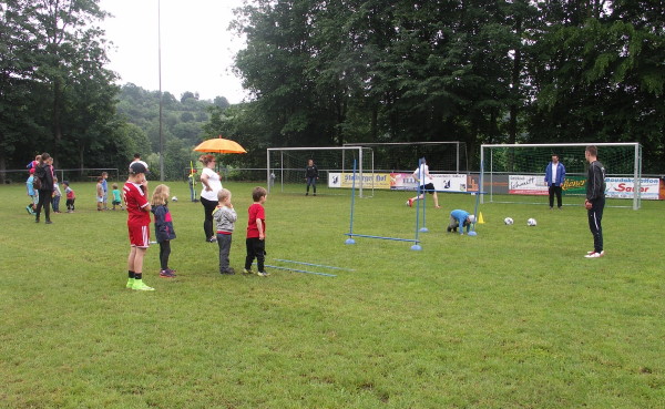 Um 11:00 Uhr ging es auf dem Sportplatz los, trotz Regenwetter kamen dreizehn Kinder, die Lust hatten, zusammen mit den Betreuern Kevin Helfrich, Fabian Schüßler und Jeremy Kindermann den Umgang mit dem Ball spielerisch zu üben. Als erstes wurde zwischen Stangen hindurch gedribbelt und auf ein ganz kleines Tor geschossen. Bei der zweiten Station ging es darum, von Hula-Hoop-Reifen zu Hula-Hoop-Reifen zu springen und dann die Torfrau Jana Pfrogner mit einem Torschuss zu überlisten. Danach kam eine Station, bei der man ein paar Hindernisse überwinden und dann auf ein Tor schießen musste.