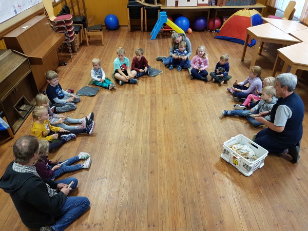 Die Einladung zur ersten Probe am 31. August 2019 erfolgte wie gewohnt mit einer eigens entworfenen Einladung. Diese wurde den Usenborner Kindern im Alter von 5 bis 10 Jahren offiziell und persönlich zugestellt. Bereits zur ersten Probe freuten wir uns über die Teilnahme von 10 Jungen und Mädchen, welche mit viel Freude und Eifer bei der Sache waren. Frau Grigoleit verteilte Klangstäbe, Rasseleier und Kazoos und so wurde direkt ein Lied über den Bahnhof und was man dort sehen und hören kann gesungen und mit den Instrumenten abwechselnd begleitet. In kürzester Zeit wendeten die Kinder alle Instrumente in der richtigen Reihenfolge an und konnten den Text des Liedes auswendig mitsingen. Mit Hilfe der anwesenden Betreuer und der Musiklehrerin wurde dann zusammen mit den Kindern ein Kanon zu „Bruder Jakob“ angestimmt. Der dann folgende „Plitsch-Platsch-Tanz“ sorgte für viel Stimmung. Hier war Taktgefühl und Beweglichkeit der Kinder gefragt. Aufmerksam und wissbegierig folgten die Kinder den Worten und der Musik von Frau Grigoleit. Insgesamt eine rundum gelungene Auftaktveranstaltung des Usenborner Musikprojekts.